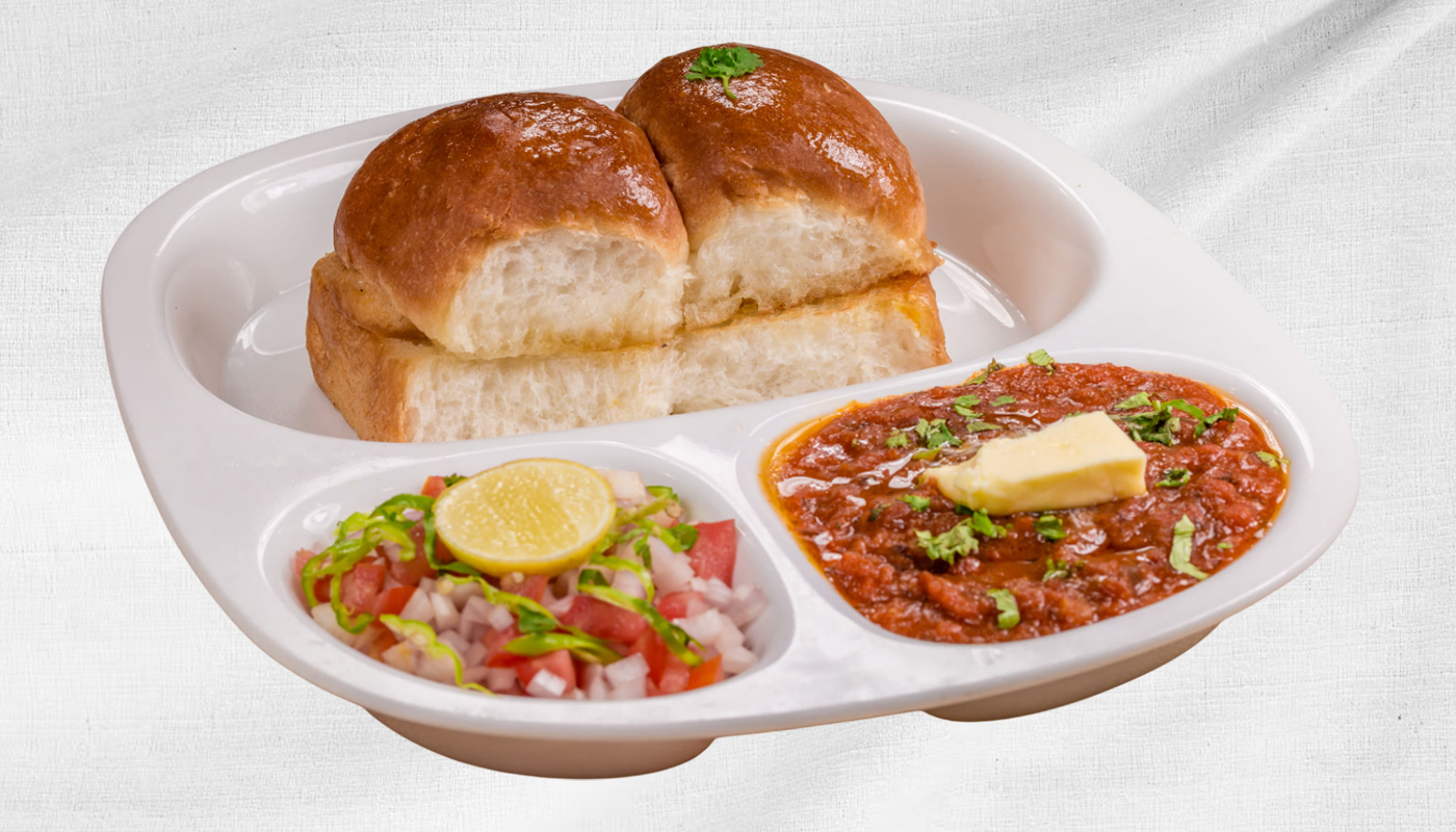 Popular Mumbai street food consisting of a thick, spicy, and buttery mashed vegetable curry (bhaji) served with soft, butter-toasted bread rolls (pav)