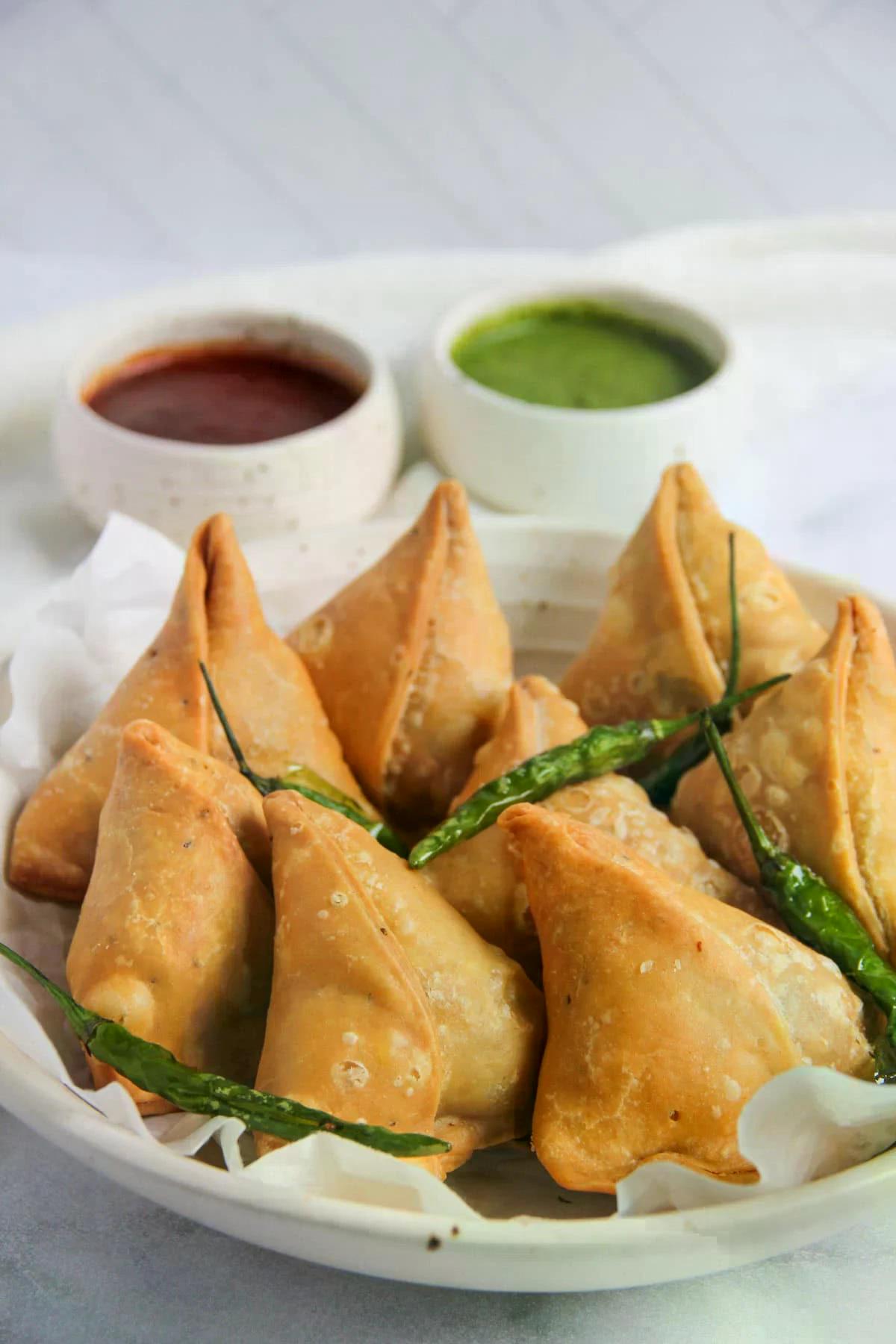 *Chef's Spl - Popular South Asian savory Snack, Triangular Crispy Shell Filled with Potato, Green Peas, Turmeric & other Spices. Accompanied with Mint Chutney.