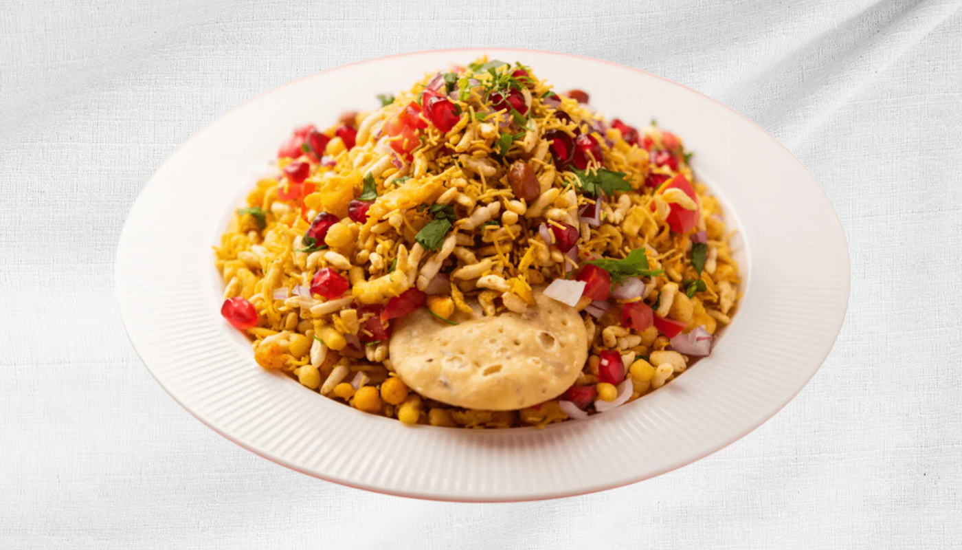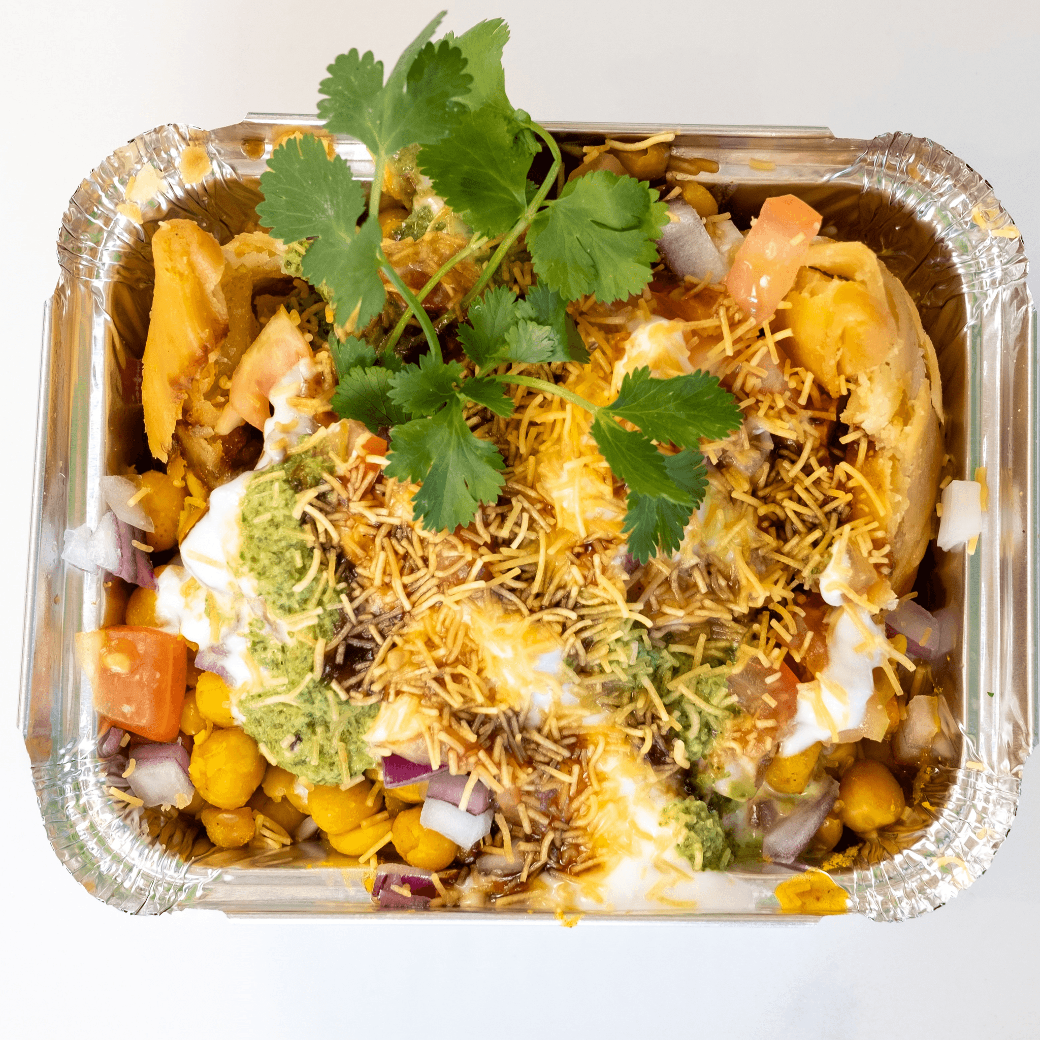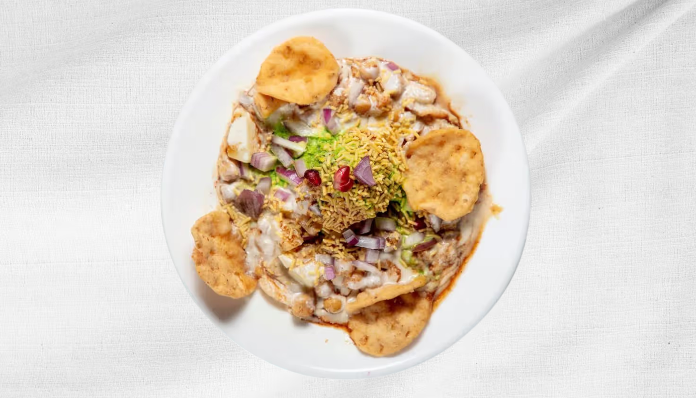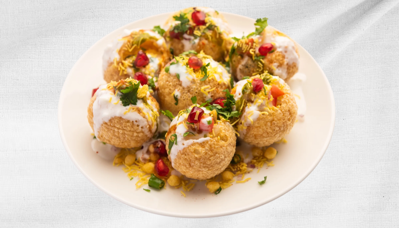 Crispy, hollow pastry shells (puris) filled with potatoes, chickpeas, and a blend of sweet, spicy, and tangy chutneys. Topped with chilled yogurt (dahi), sev and spices,