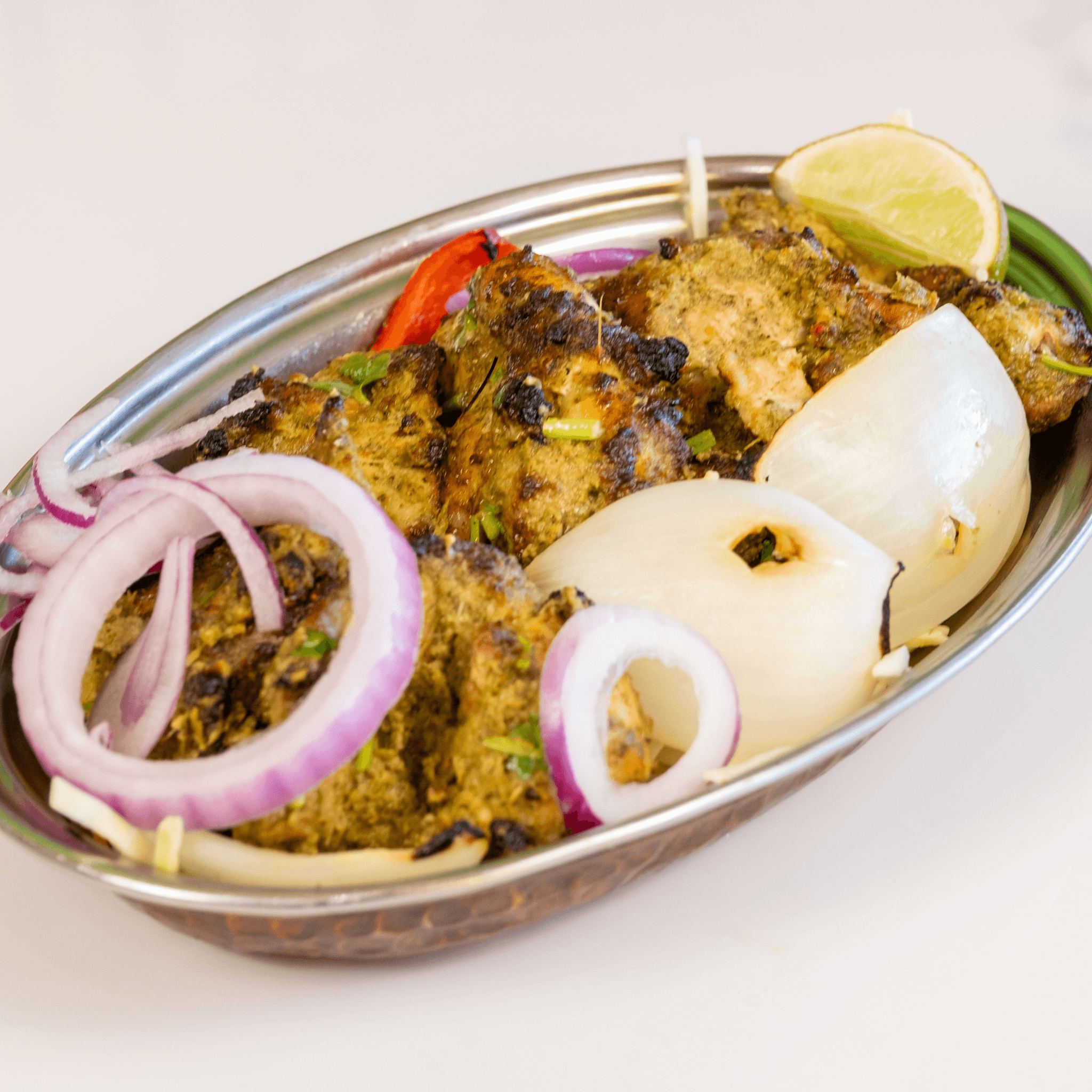 Chicken Marinated In Spices, Yogurt, Ginger And Garlic, Roasted In A Tandoor To Smoky Perfection. Served with your choice of rice or naan, a samosa, mint chutney, and pickled onions.