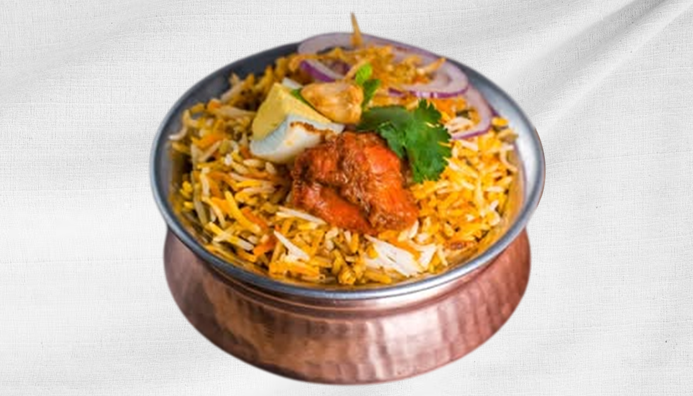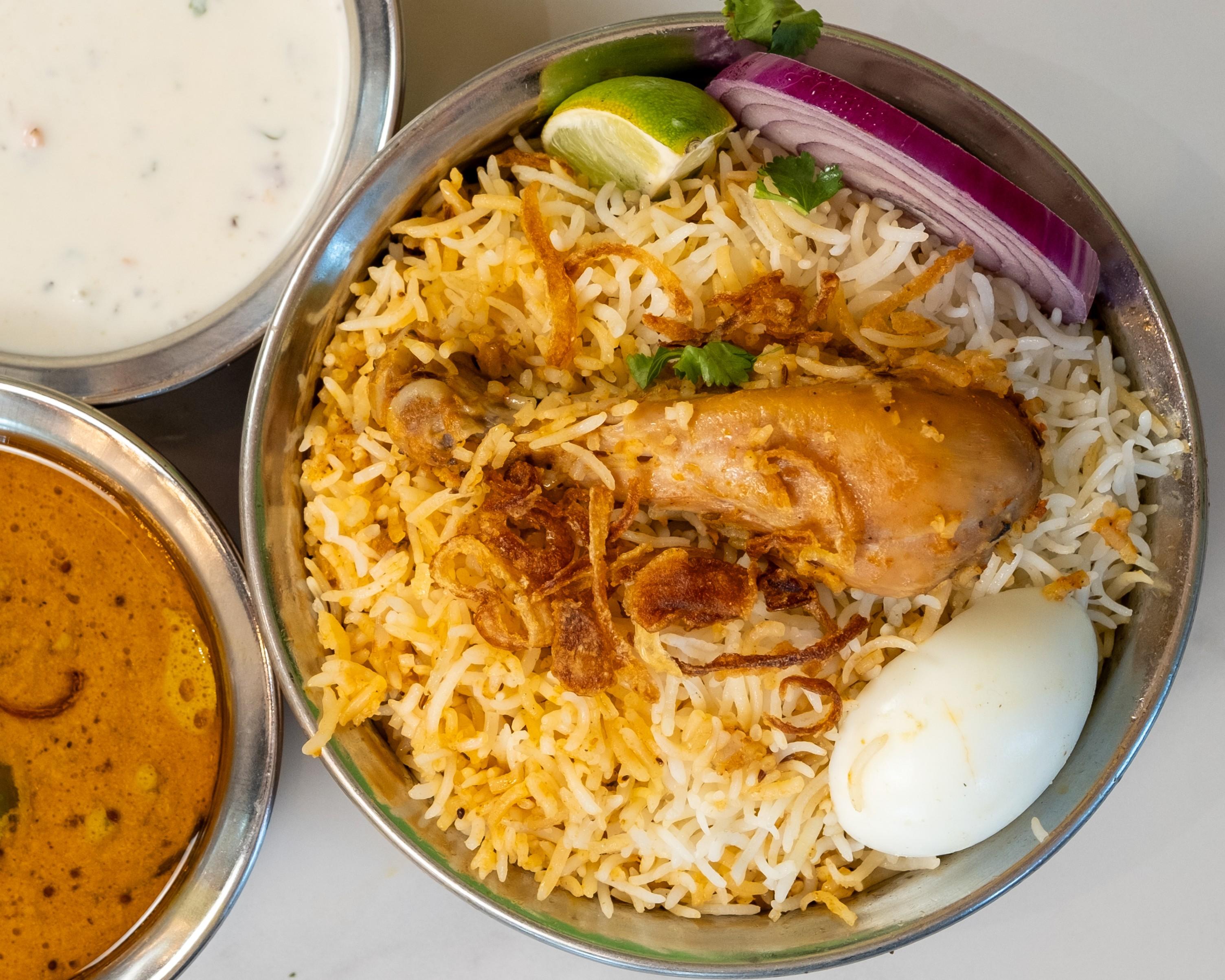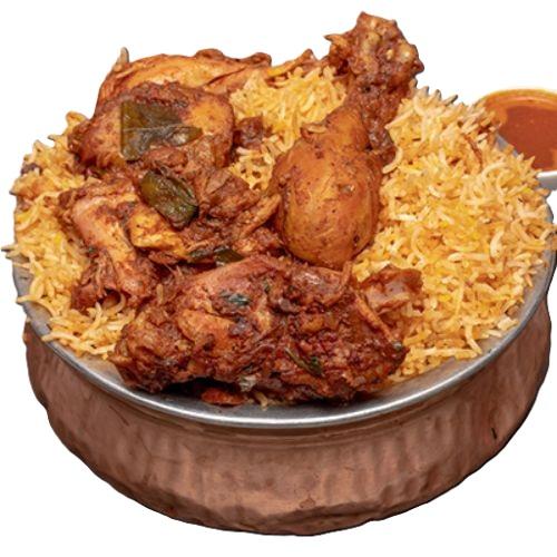 *Chef's Spl - Authentic Hyderabadi Dum Biryani slow-cooked using royal spices, Chicken layered with fragrant basmati rice, Sealed To Perfection. Accompanied with Yogurt Sauce & Salan.