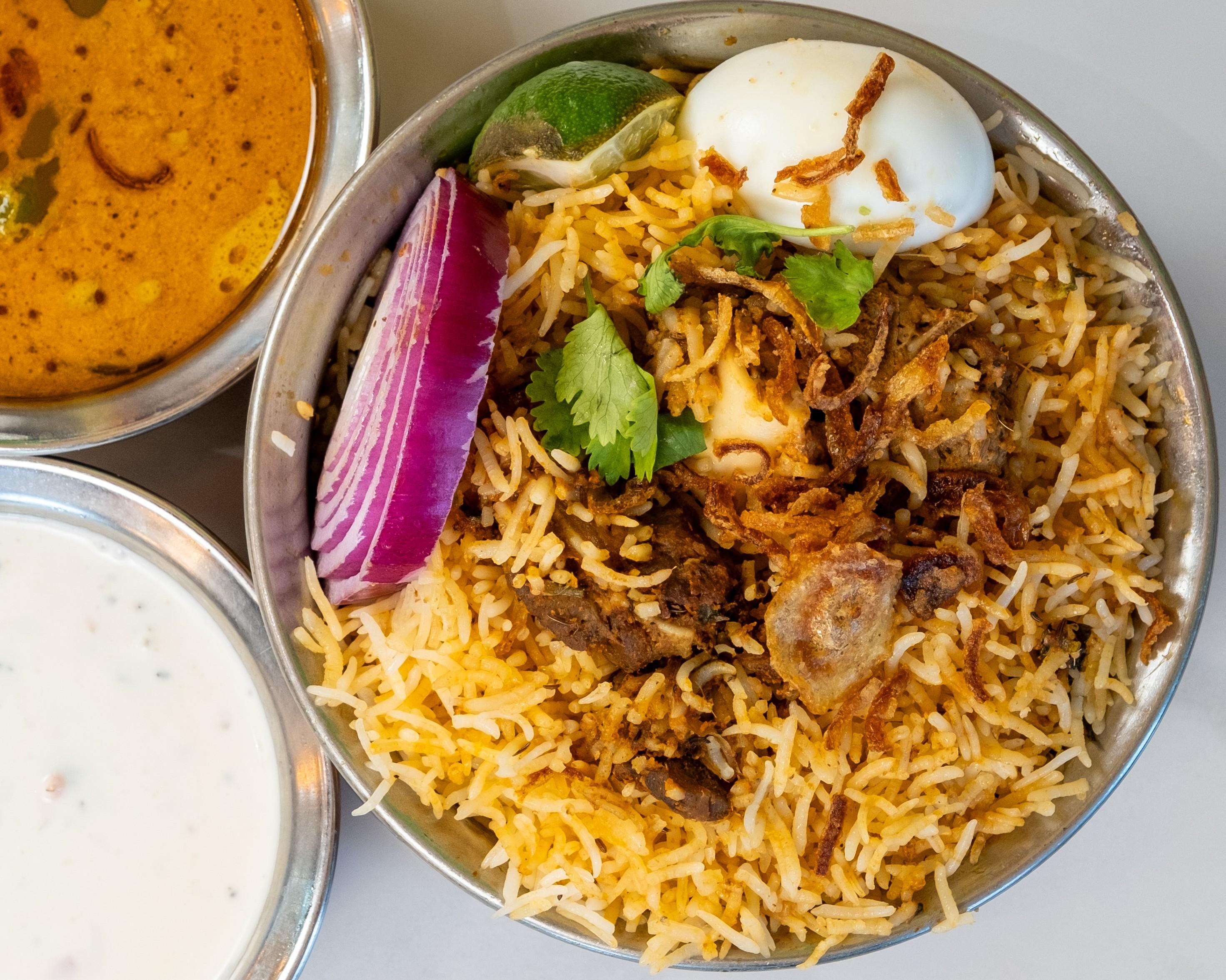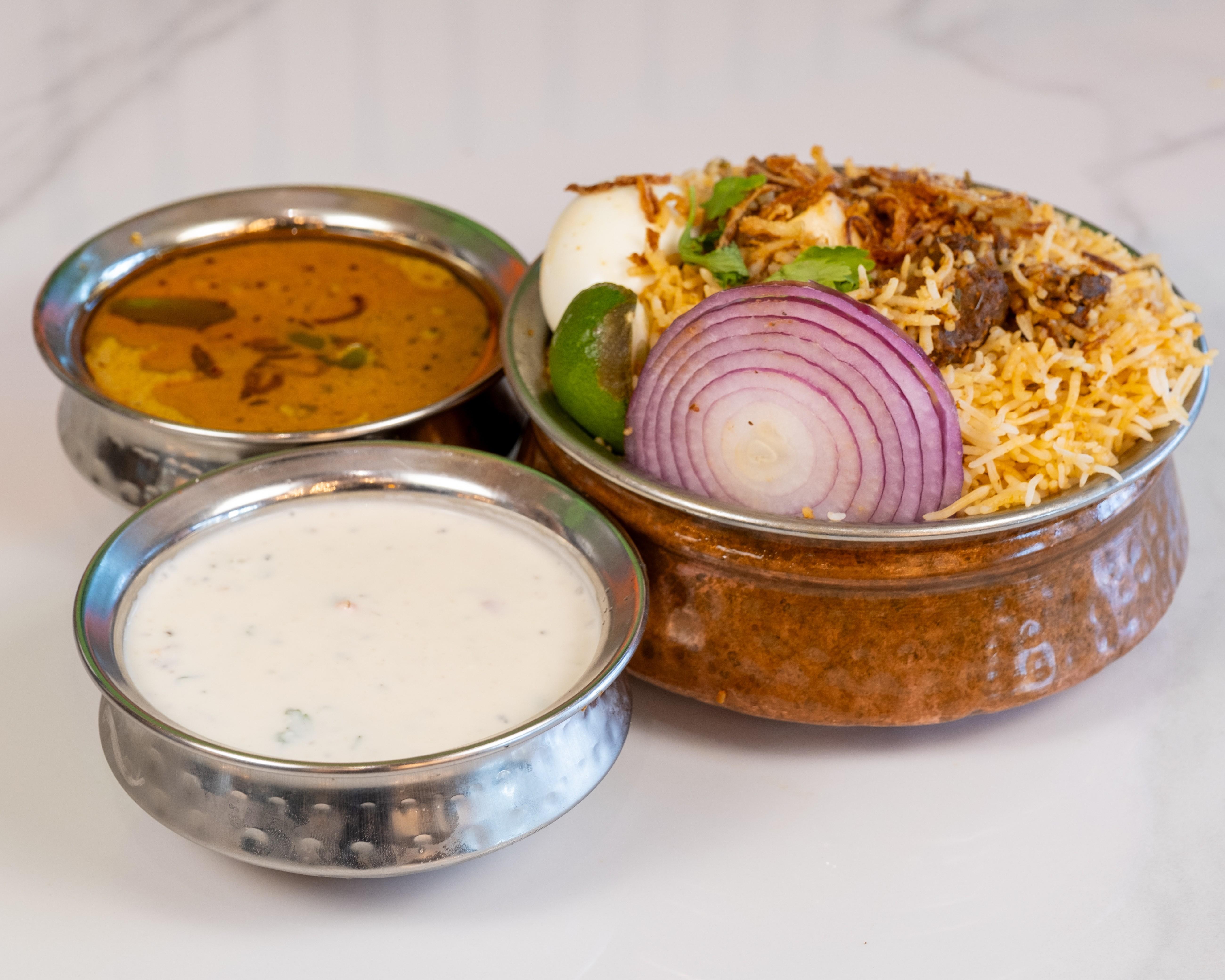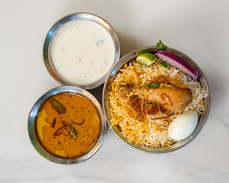 Andhra-Style Boneless Chicken Biryani Packed With Subtle Creamy Flavors. Accompanied with Raitha(Yogurt Sauce) & Salan