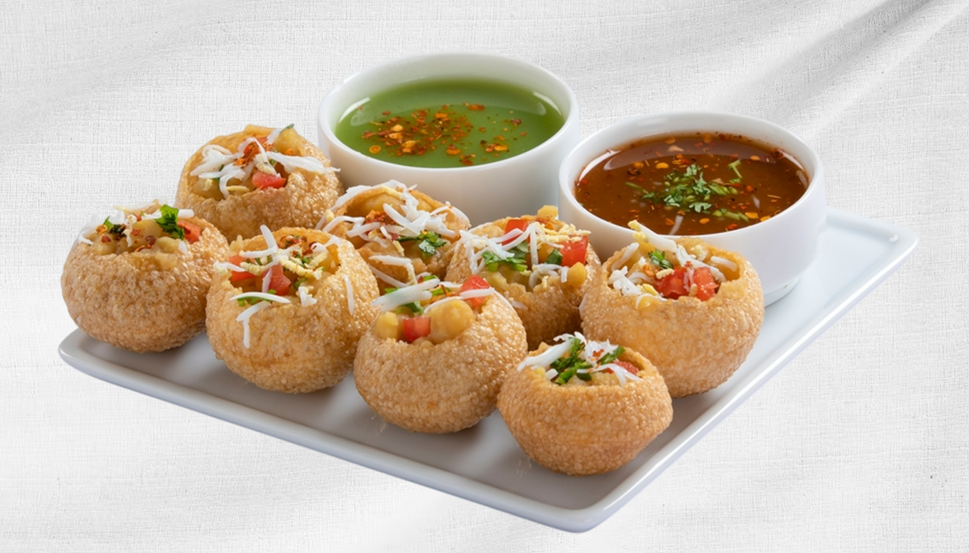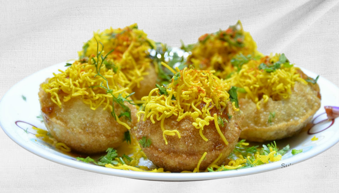 Crispy, hollow pastry shells (puris) filled with potatoes, chickpeas, and a blend of sweet, spicy, and tangy chutneys. Topped with Sev (fried gram noodles), Yogurt and spices