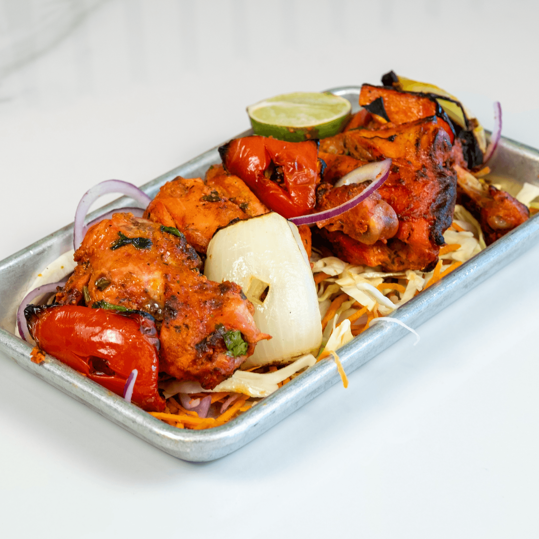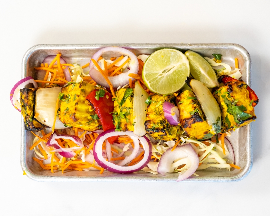 Soft cubes of paneer marinated in spiced yogurt and grilled to smoky perfection. Accompanied with Mint Chutney & Indian style pickled onions