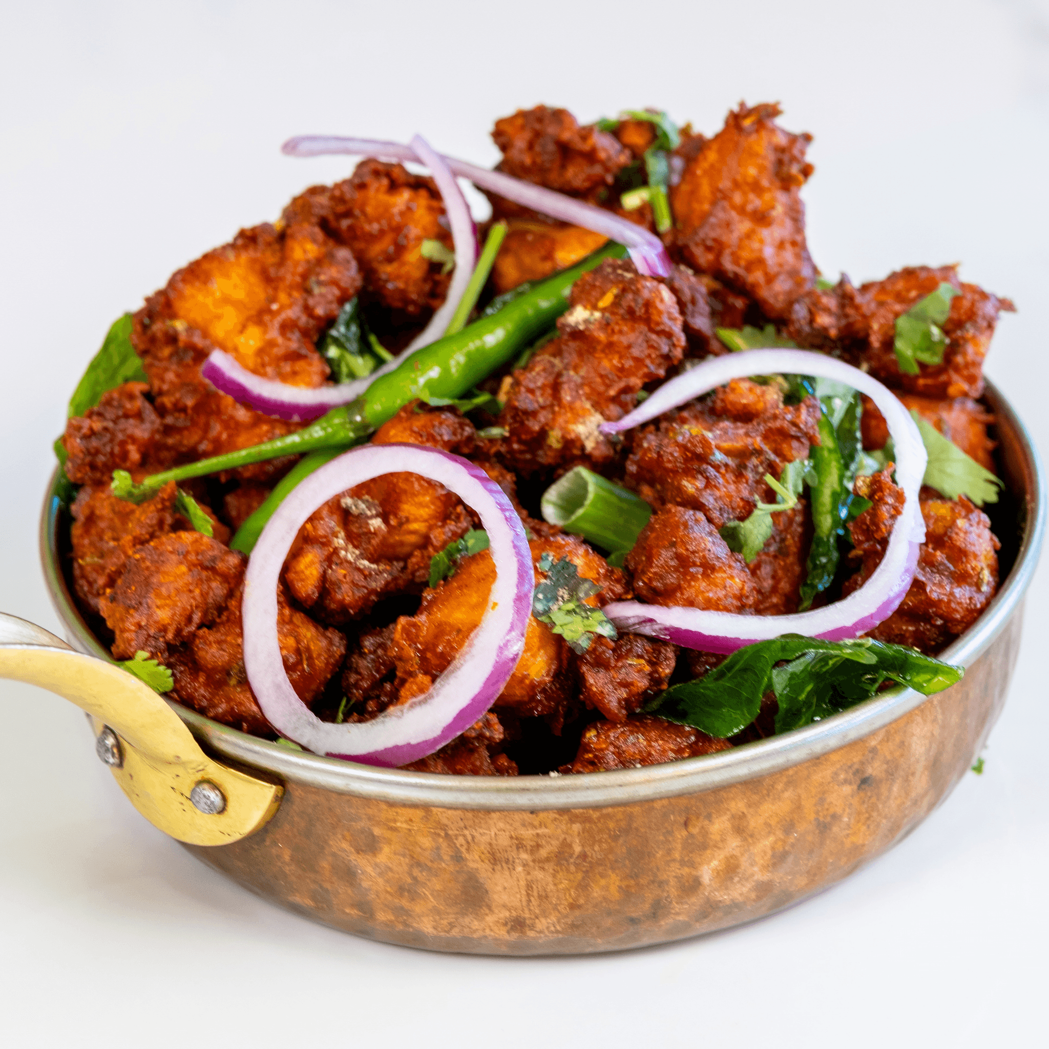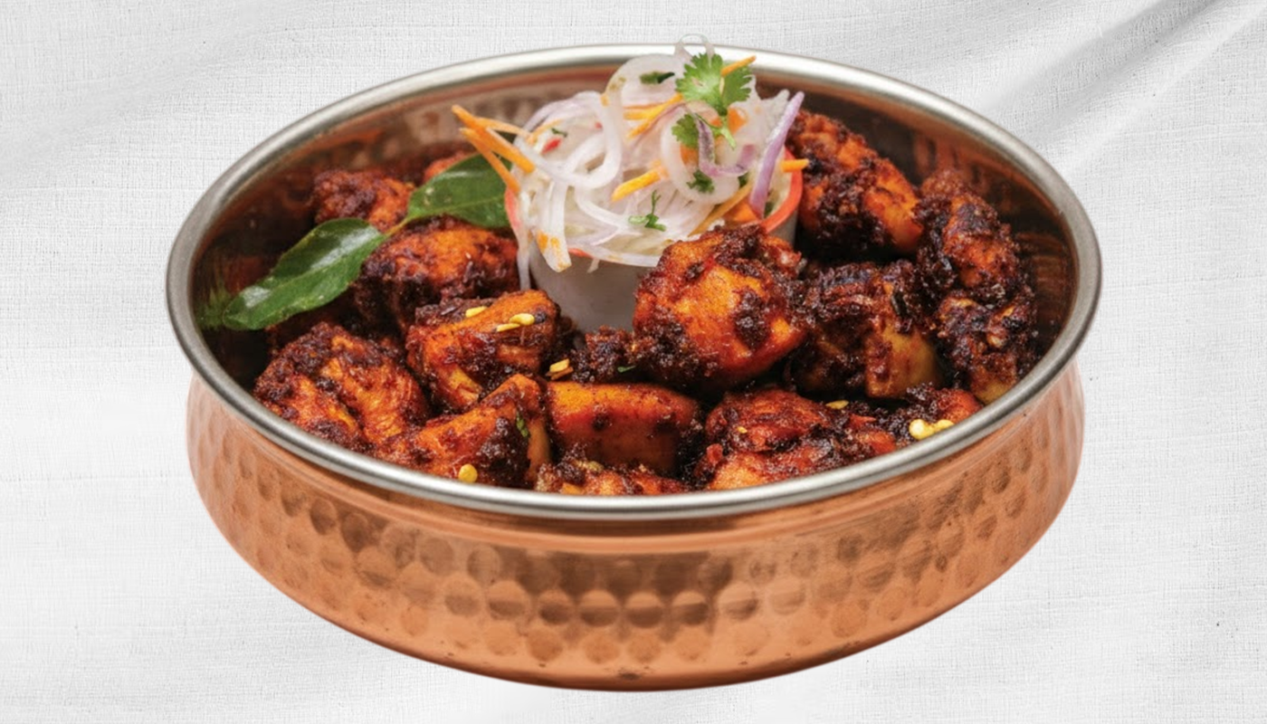 Deep-Fried Chicken Starter Tossed With Curry Leaves, Tangy Yogurt Sauce, Green Chilies, Garlic, And Bold Spices.