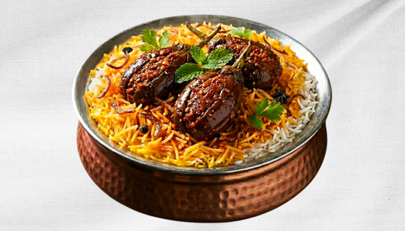 Family Portion of Andhra-Style Biryani Made With Stuffed Eggplant Simmered In Rich Spiced Gravy Layered With Rice